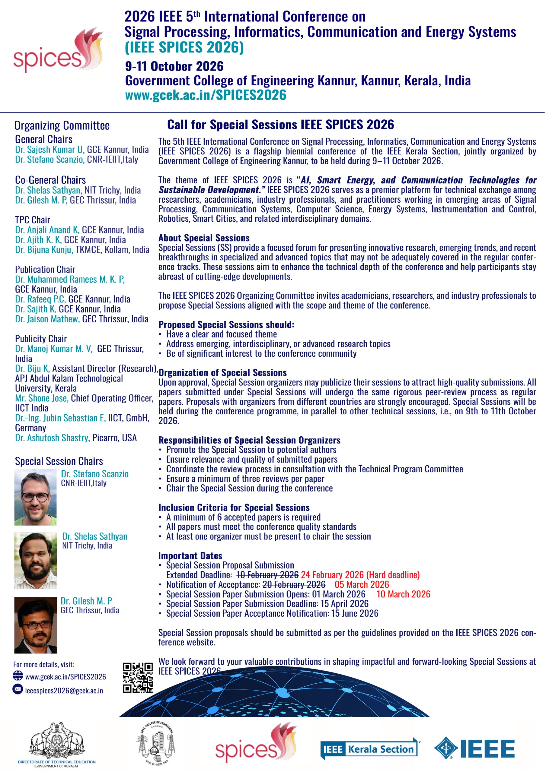 2026 IEEE 5th International Conference on Signal Processing, Informatics, Communication and Energy Systems (IEEE SPICES 2026), is a flagship event of the IEEE Kerala Section. The conference is jointly organized with the Government College of Engineering, Kannur and will be held at the same institution during October 9–11, 2026. The conference theme, “AI, Smart Energy and Communication Technologies for Sustainable Development,” highlights the role of intelligent and sustainable technologies in shaping future digital and energy ecosystems. IEEE SPICES 2026 provides a global platform for researchers, academicians, industry professionals, and practitioners to exchange ideas and present innovations in areas including Signal Processing, Communication, Computer Science, Energy Systems, Instrumentation & Control, Robotics, and Smart Cities. The technical program features keynote speeches, plenary talks, regular technical sessions, and special sessions.