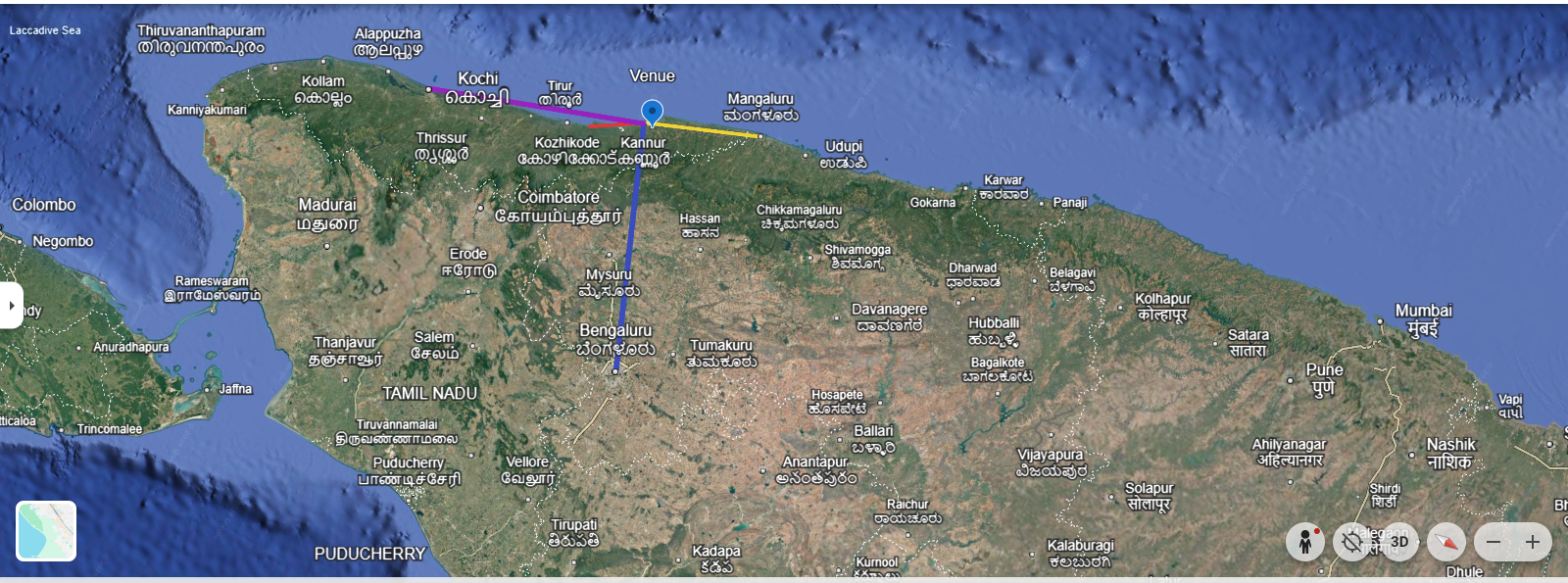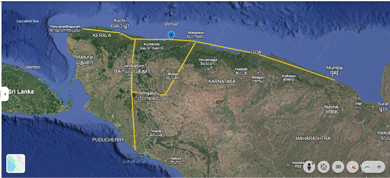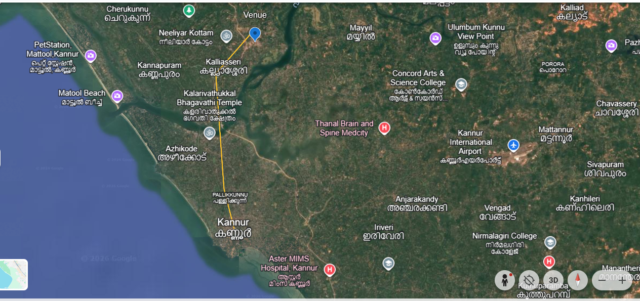 Nearest airport is Kannur International Airport (CNN), about 35 km from the venue (how to reach). Kozhikode International Airport (CCJ) and Mangaluru International Airport (IXE) are approximately 150 km away from the venue. International travellers can choose Bengaluru International Airport (BLR – 350 km) or Kochi International Airport (COK – 275 km) and then take a domestic flight to Kannur.