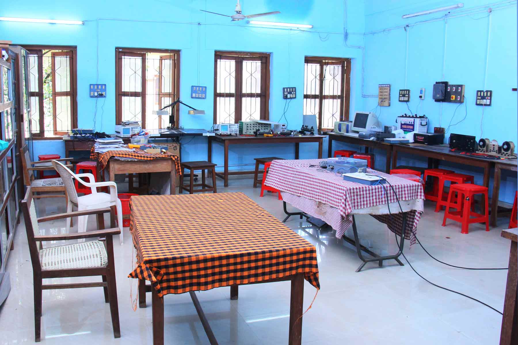 The lab is equipped with all materials needed for electrical wiring circuits. Students are introduced to various wiring materials, their specifications, and also get trained to wire up simple circuits of lamps controlled by switches and prepare an estimate of the materials required. Other accessories required with installation such as MCB / ELCB etc. are also familiarized here. The lab is also equipped with meggar and insulation tester required for testing of installations.